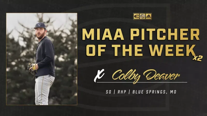 Emporia State sophomore pitcher Colby Deaver has been named the Co-MIAA Pitcher of the Week, his second weekly honor of the 2026 season. Deaver picked up the win last weekend with six shutout innings in a Hornet victory over the Cougars. Deaver struck out 10 in the game including two innings where he struck out the s...
