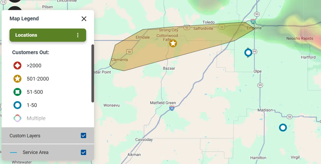 The late-Friday and early-Saturday storms have caused another issue. Over 1,100 Evergy customers have been offline from southwest Emporia to Clements due to storm activity, although virtually all those outages were restored by 2 am. Over 360 4 Rivers customers in Lyon and Chase counties were affected, along with nearly 40 Flint Hills Rural Electric Cooperative customers in Chase and Morris counties.