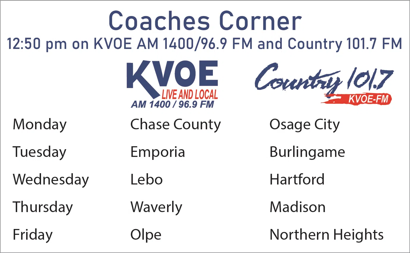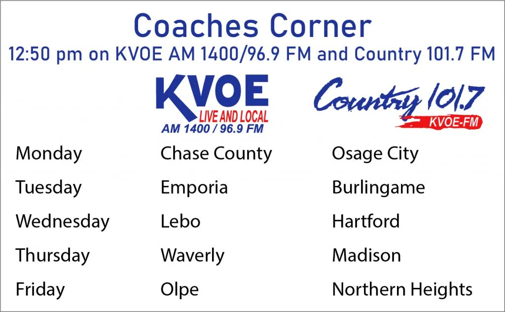 Coaches Corner is a weekly interview with Area High School Coaches that runs from the start of football season through the end of basketball season. Hear from the coaches of all the area high schools at 12:50 on either KVOE AM 1400/96.9 or Country 101.7. You can listen to past interviews via https://kvoe.com/audio-vault/